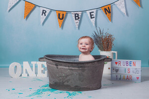 Is je kindje bijna jarig? Tijd voor een feestje! In de studio maken we eerst mooie foto's van uw kindje en de taart. Hierna mag er naar hartelust geproefd en gevoeld worden. We eindigen met een badsessie. Leuk om bijvoorbeeld als uitnodiging voor het verjaardagfeest te versturen! De taart wordt verzorgd door een bakster uit Rolde. Graag vroegtijdig reserveren.