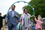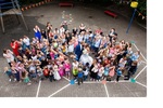 Het bruidspaar tussen alle kinderen van de basisschool.
